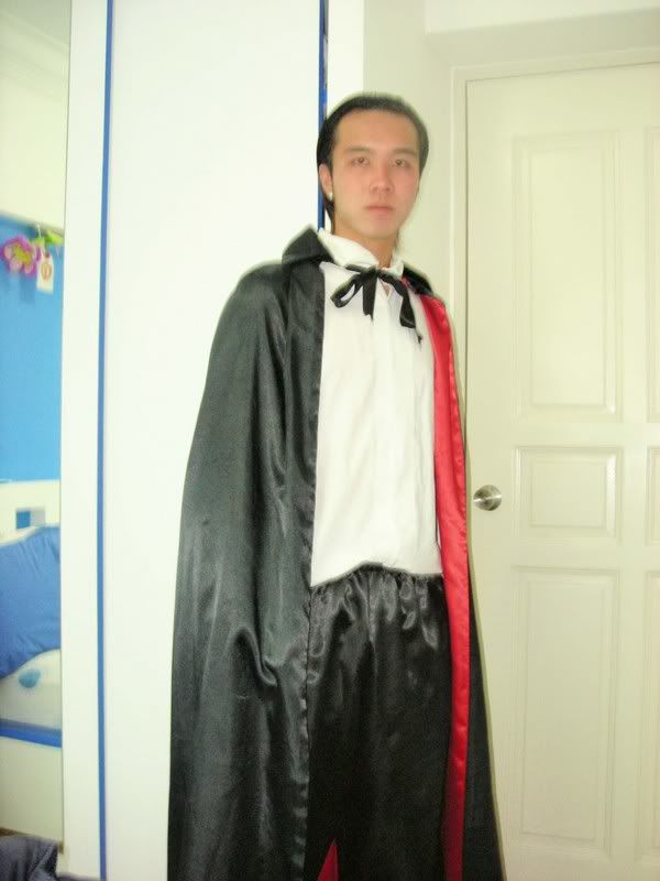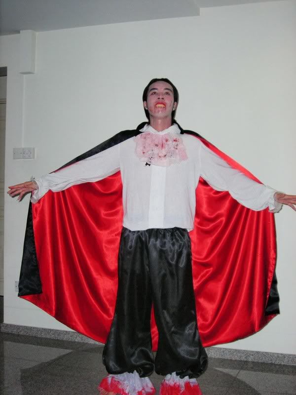 Frankenstein? I chose the latter in the end. Finally, on friday evening, i went down to this place at Aliwal St to look for this shop called "No.1 Costume Costume" which had claimed to be the largest costume store over in s'pore. Well, i had to get all my stuffs ready for halloween rite. Just kept my fingers crossed that the stuffs i was looking for were still available. It was quite difficult at first to find the shop as all i knew of it was that it was located somewhere opposite the Concourse building which was at Beach Rd. However, given the smart st knowledge which i possessed, it soon took me just a few minutes before i finally found the place. It was like a ghost town on the outside, all deserted & quiet but once i stepped into the shop, man, really took me by surprise. The whole place was so chaotic & true to their words, their shop was really very big, with rows & rows of assorted costumes & many various kinds of wigs, masks & accessories. Omg! I was stunned for quite sometime, just browsing at all the different stuffs which they had. Furthermore, there were so many ppl in the shop, running here & there with their costumes & stuffs in their hands, while some just tried it out on the spot & showing off to the many ppl that were there. Really quite a funny sight to behold. So many different characters; samba dancer, elvis, snow white, cowboy etc. Woah! Just by seeing all those ppl over there looking for their items like me had me imaginating that the halloween party would surely be mind-blowing to say the least! Played around with a few of the different masks & accessories while waiting for Eddy to arrive as i need his comments on my costume, but sad to say, he ended up waiting for me over at Fusion instead as he called up last minute to tell me that the place was out of the way for him. Was bit disappointed but what to do, afterall i flew his "aeroplane" so much more times then he flew mine. Back to the main subject, thank god for me that there were still 2 more costumes under the category for dracula. They were almost similar cept for the pants, 1 being black whereas the other was white. Tried both sets of costume over at the fitting room for quite sometime before deciding eventually on the black 1 as white top & white pants wouldn't look as classy as white with black. After getting my costume, i finally left Aliwal St with some glee on my face. However, being the careless idiot which i was, guess what i forgotten to get over there(p.s a very impt thing)? Haha. Most of u must be scratching ya heads by now. Well, i actually managed to forget bout my vampire's fangs. Yes, that's rite! Imagine being a dracula w/o fangs. Omg! Faint! Actually, i wasn't entirelly to blame too as Eddy kept calling me to hurry down to Fusion for our game of pool, thus, i totally forgotten bout it. Decided to head over to town the next day to get all the necessary items which i needed. Below are the pics of my costume: