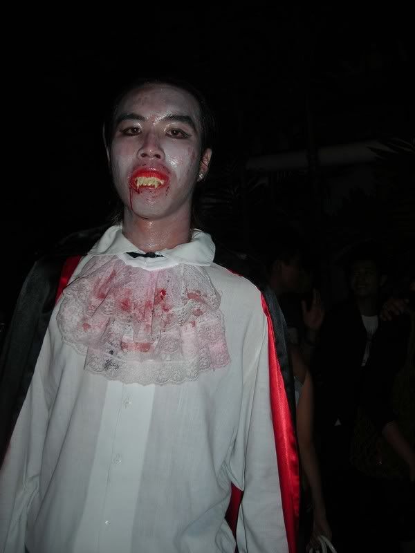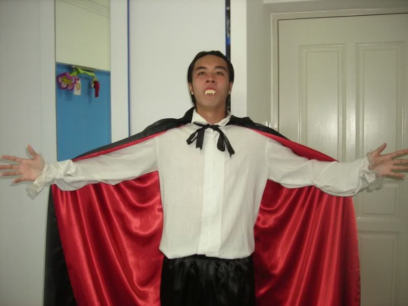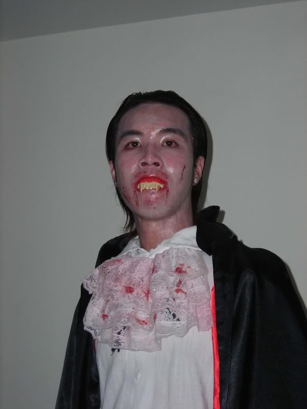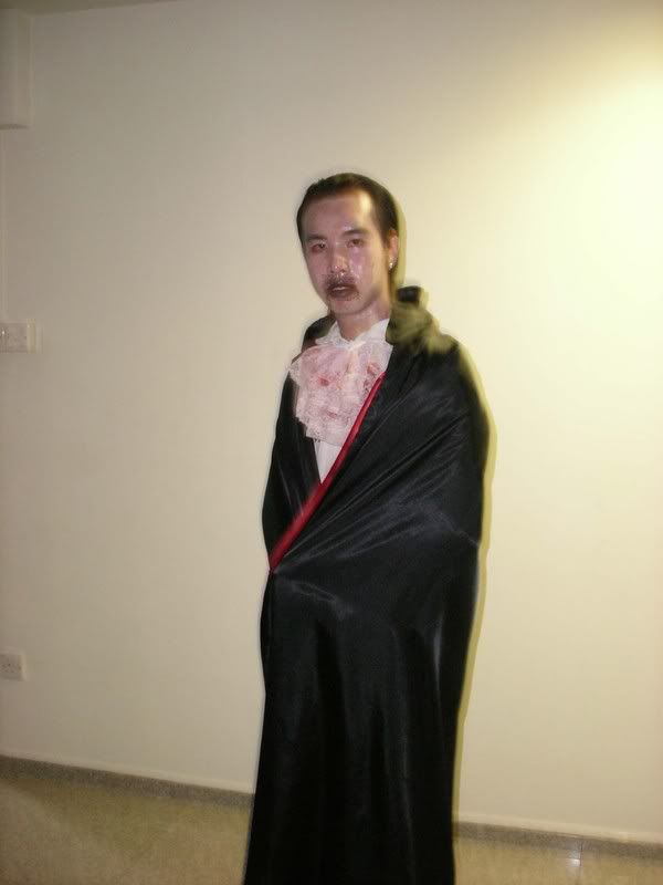 Due to anxiety & excitement, i couldn't sleep for the whole freaking nite. Ended up playing soccer early in the morning with Eddy & friends over at Permei area before heading to 1 costume shop over at Lucky Plaza. Gosh, i was wondering to myself what would become of me when nite falls given that i haven't slept a single bit & now having just played a gruelling match of soccer under the hot sun. Surely would be like a zombie in the nite, but then again, i was going to dress up as Mr Dracula, hence doesn't really make any difference. Haha! Got my pair of fangs which wasn't easy at all to decide as they had a few different kinds & some white face paint due to dracula's face being whitish in color. It just looks wierd seeing a "cheenah" looking vampy lah! I knew bout all these after researching on some dracula info over the net the night before. Next stop, went over to Toys'r'us at Forum to get some fake blood due to it being sold out over at the shop at Lucky Plaza. In order to create something that's gruesome, i definitely need that. Slacked around over in town till evening time before heading home to start my transformation into Mr Vampy, aka Count Dracula!!! Haha.