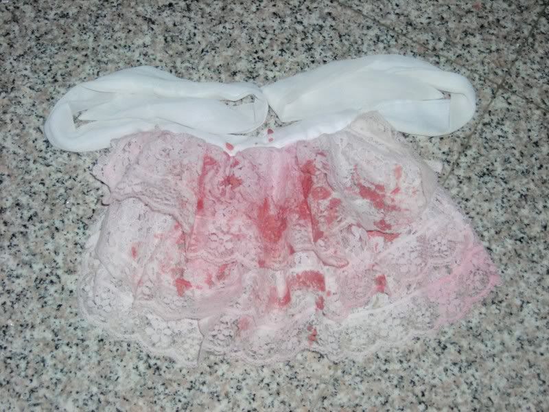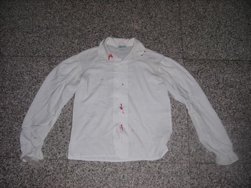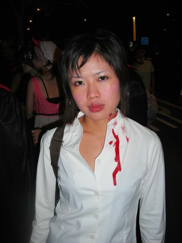 Well, by then, the lovely Pris was already waiting over at the entrance of zouk for me while i was on the way there. She sms me saying that there were lots of ppl & that the queue was freaking long. She even doubted that we could enter the club as there really was plenty of ppl. I told her to wait for me patiently while i arrived, feelings all hyped up & excited. To think i was so shy earlier over at my area, but i heaved a sigh of relief upon reaching zouk as there were plenty, i really mean plenty of ppl dressed up in costumes. Suddenly, i was like 1 of them, did not feel odd anymore. Met up with Pris soon after. She was quite surprised upon seeing me, afterall this being the first time she ever saw me in this type of wierd image. She complimented me, saying i was really sporting & really look like a true vampire! I mean, come on, this is Halloween ya know, time to let down your hair & have some fun. We went to a corner for some final touch up; Pris touching up my make-up for me, drawing my eyes with thick eye-liner & applying reddish lipstick for me. The finale was the best though, squeezing the artificial blood onto my mouth to make it drip all over, so as to ensure it looking realistic. However, by doing so, i accidentally swallowed down those fake blood. Yucks! The taste was damn sucky. Next up, she did some final touch-up on herself. Oh ya, by the way, both of us had some sort of a theme like that for the nite. She suggested being some sort of school gal who was being bitten by me, Dracula. Hence, to make the bite looked real, i drew 2 holes on the left side of her neck, before smearing the fake blood all over it, some even dripping onto her shirt.