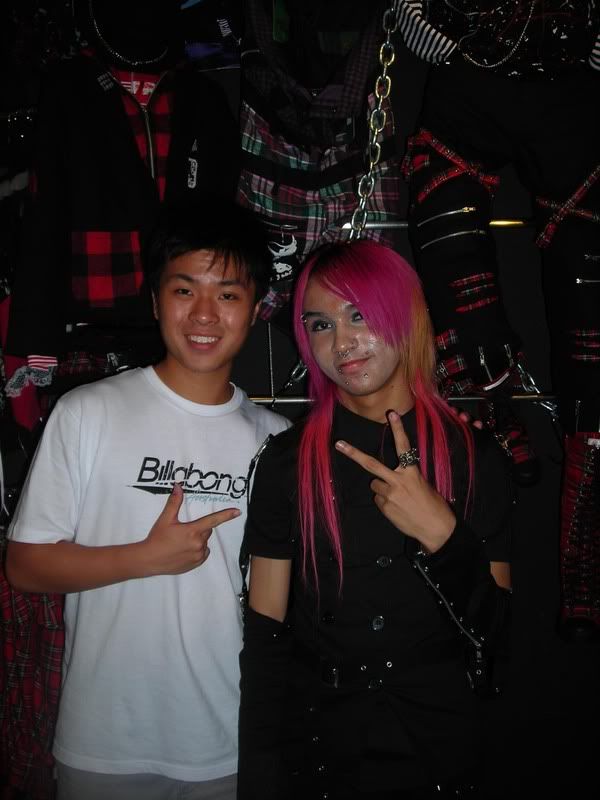 The first of many picsFortunately for us, we did managed to find a suitable hotel that could satisfy our basic needs at the end of the day. Phew! Thank god! After washing up and leaving our stuffs behind, we headed straight to the densely populated shopping area in KL so as not to waste any precious time. Though i've forgotten the name of the area, but it's somewhere whereby Sungei Wang and Times Square are located. Hours later, after much shopping, shopping and more shopping! The both of us bought lots of things, mainly clothes as they were cheap when u convert the currency rates. While shopping at one of the shops there, we chance upon this very cool gothic looking guy which u rarely would see in s'pore. Needless to say, my dear brother insisted on taking a pic with him.