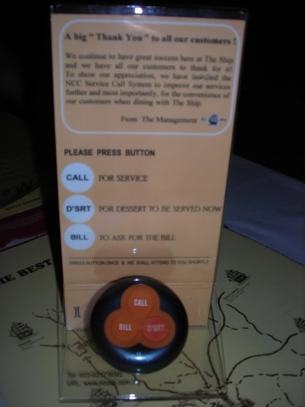 While we were having our dinner, we spotted something interesting. For every table in The Ship, they had this round device whereby there's 3 buttons for u to press. They are namely the Call, Bill and Dessert buttons. All u need to do is to press each individual button for the type of service which u required and their "sailor" would soon attend to your needs within a few seconds. Very efficient and time-saving, instead of standing up or waving your hands like a silly idiot to look for the waiter to serve u. I would recommend this service or rather device to most shops in S'pore as up till now, i've yet to see something similar over here.
