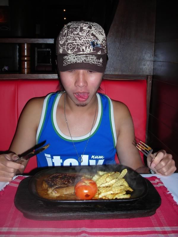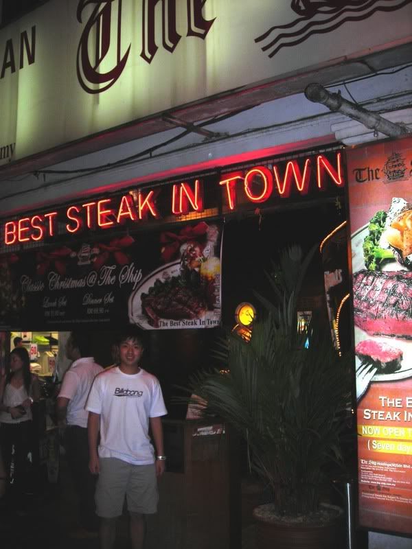 Best friends in a foreign landAfter monkeying around and lots of walking, our legs were becoming wobbly and stomachs were rumbling. We needed to find some place for food. I recommended Eddy to this very famous steakhouse called The Ship as it was my favourite steakhouse during my childhood days. For all u guys who still doesn't know this, i grew up in M'sia for your info. Furthermore, they had supposedly the best steak in town. We were just going to check out the menu outside the restaurant when we could smell the fragrant bbq steak aroma coming out of the entrance. Instantly, we made up our minds to have our dinner there. The whole decor inside the restaurant was exactly like what u would imagine in a ship, except that the ambience would be different. Even the servers were decked out in sailors attire! In the end, Eddy had roast turkey while i had my all-time favourite sizzling ribeye steak.