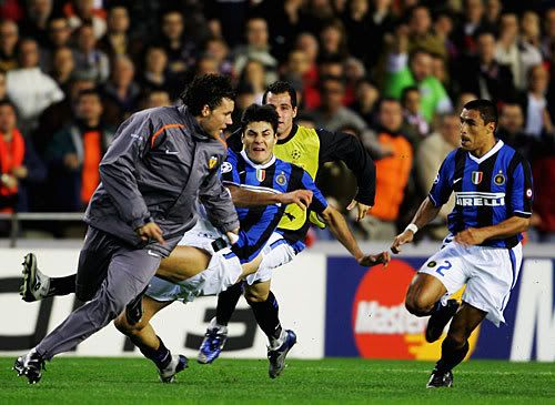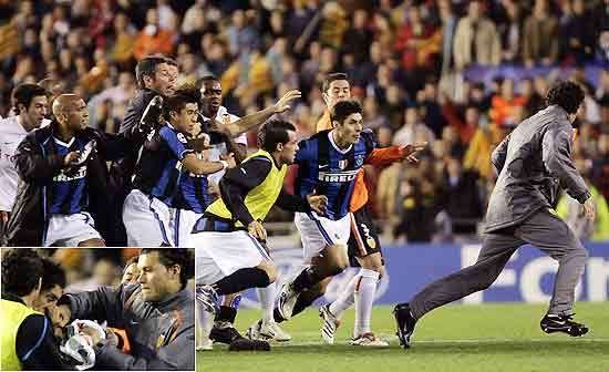 Well, back to the topic, whichever way you look at it, i believed that a bit of bad losing would normally have spiced up the affairs. And last night's mass brawl between Valencia and Inter at the Mestalla was just hilarious. Now, don't get me wrong, I'm not advocating violence. Valencia substitute David Navarro broke Nicolas Burdisso's nose to spark the melee and that's not on.